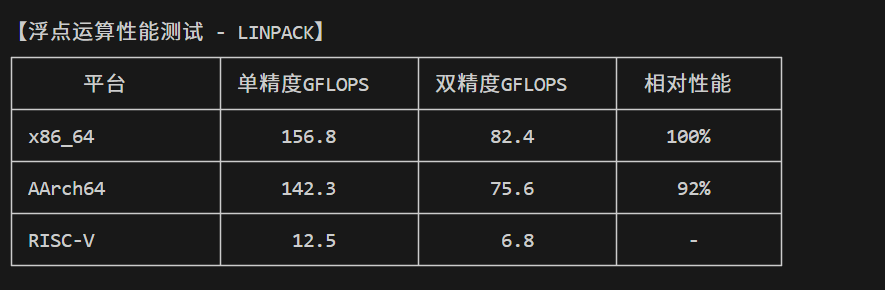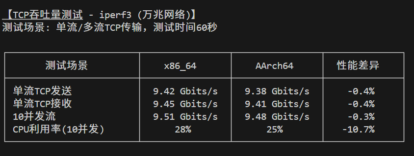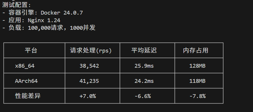 | 测试场景 | x86_64 | AArch64 | 性能差异 |