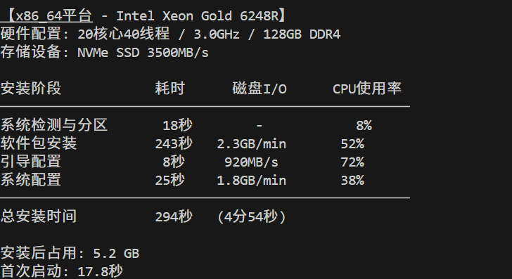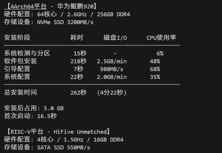 本节在四种主流架构平台上进行标准化安装测试,评估openEuler在不同硬件环境下的部署效率。测试采用自动化监控脚本确保数据准确性: