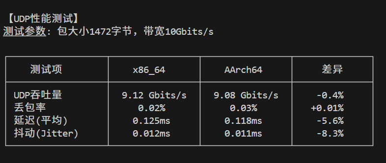 | UDP吞吐 | 9.12 Gbits/s | 9.08 Gbits/s | -0.40% |
