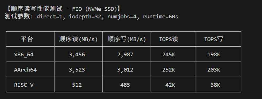 本节使用FIO工具进行标准化磁盘I/O测试,评估openEuler在不同架构下的存储性能: