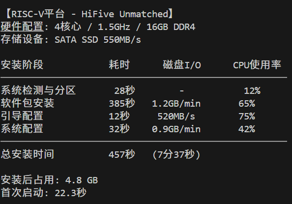 | RISC-V | ✓ 完整支持 | 2.8 GB | 3,850+ | 4分02秒 | 11.85 MB/s | 12.31 MB/s |
