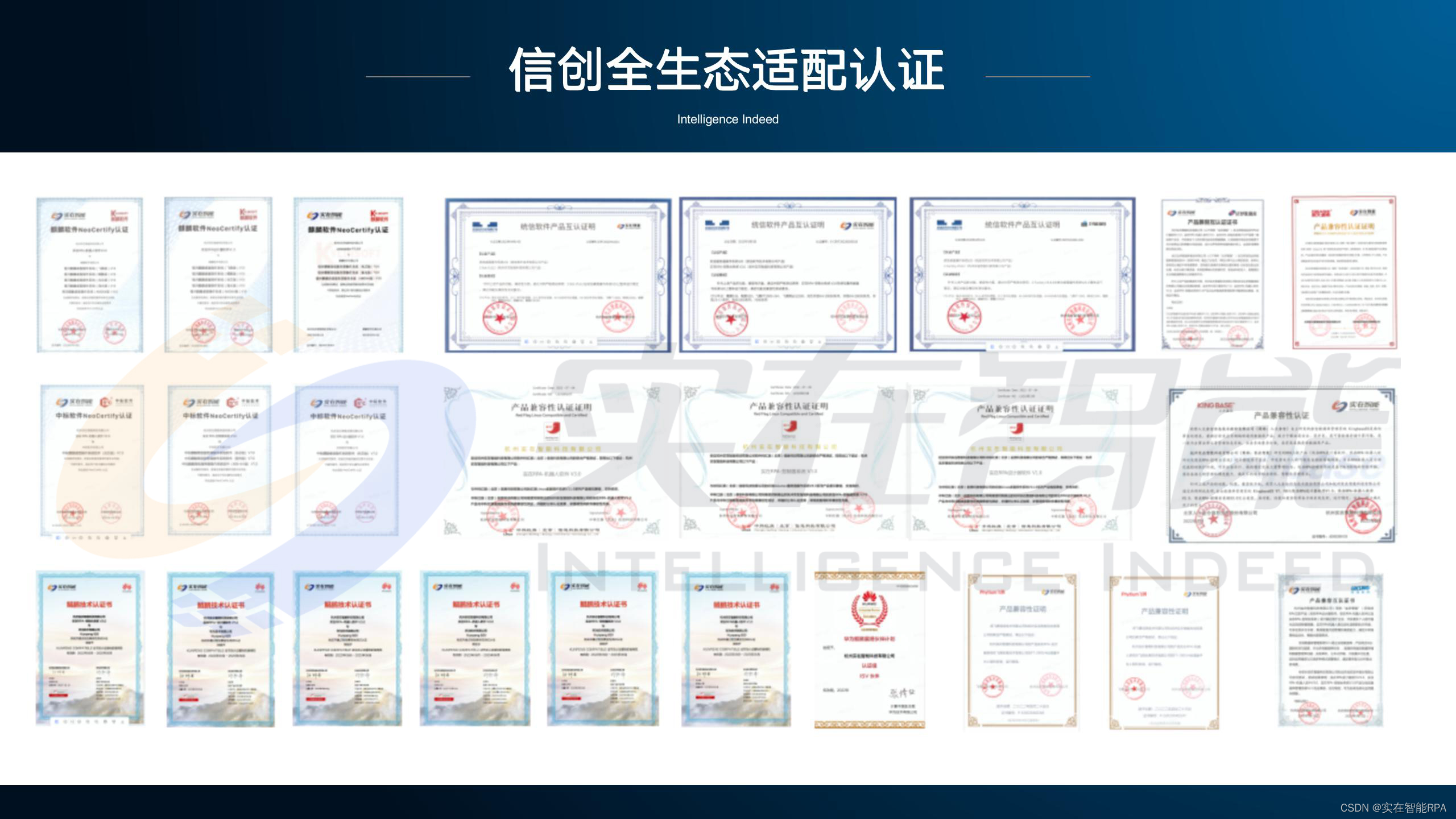 实在智能作为国家级高新技术企业,全栈国产自研的核心技术已累计近40项发明专利授权、获得软件著作权登记近200项,在RPA行业中实授发明专利数长期位居第一,为国产信创建设和政府单位、国企央企的数字化转型提供安全可靠的解决方案和自主创新、安全可控的产品技术,实在智能数字员工已在全国多家政府、企业的各种组合配置的国产信创系统中稳定运行数百万小时。