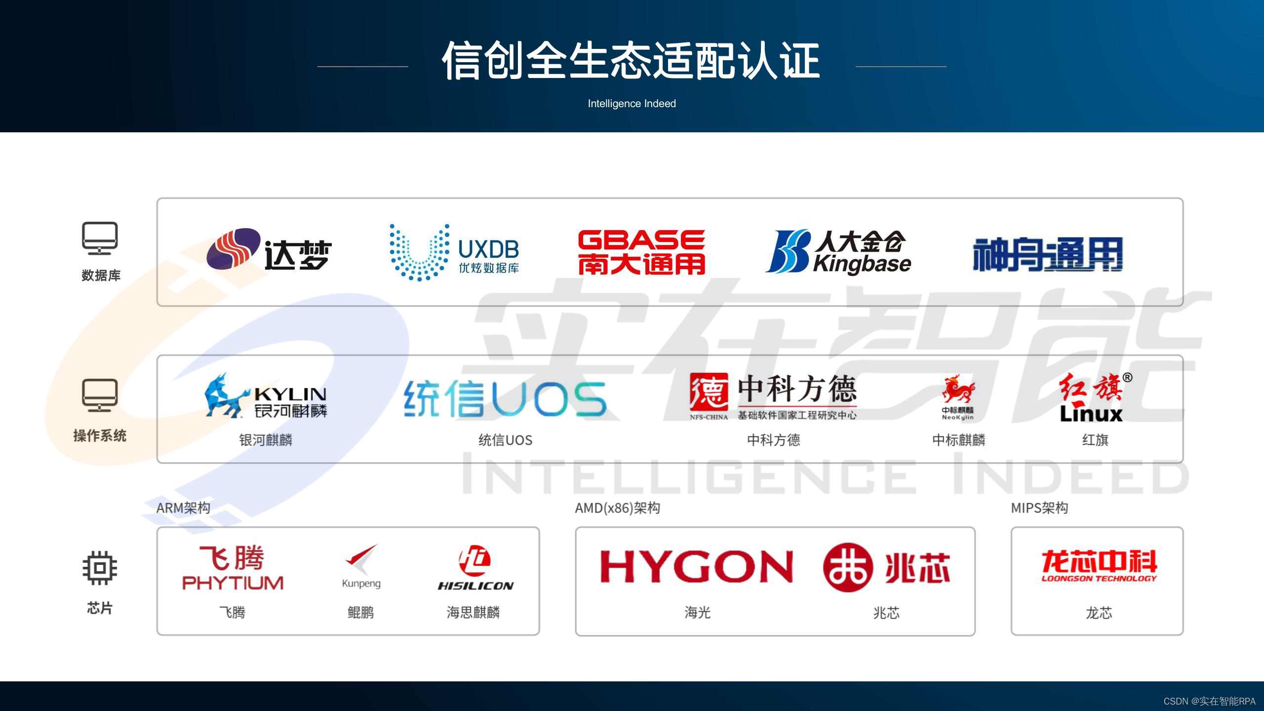 实在智能也始终紧跟数字中国建设的步调,聚焦信创产业发展需求,构建安全可靠,稳定先进的数字底座,并与飞腾、华为鲲鹏、龙芯、海光、统信、麒麟、openEuler、openGuass等积极构建生态合作关系,同时,实在RPA可广泛兼容各类行业主流芯片、国产数据库、国产服务器和操作系统,还支持全面适配产品性能以达到甚至超越国际领先产品的东方通中间件,共同扩大信创生态圈建设。通过实在智能搭建的超级自动化平台,