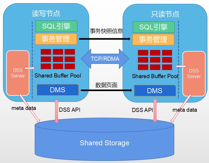 - 读写节点和只读节点之间通过TCP或RDMA协议使用DMS组件共享Shared Buffer Pool中的热数据页。