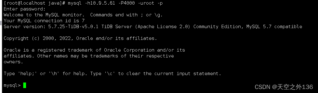 mysql -h10.9.5.61 -P4000 -uroot -p