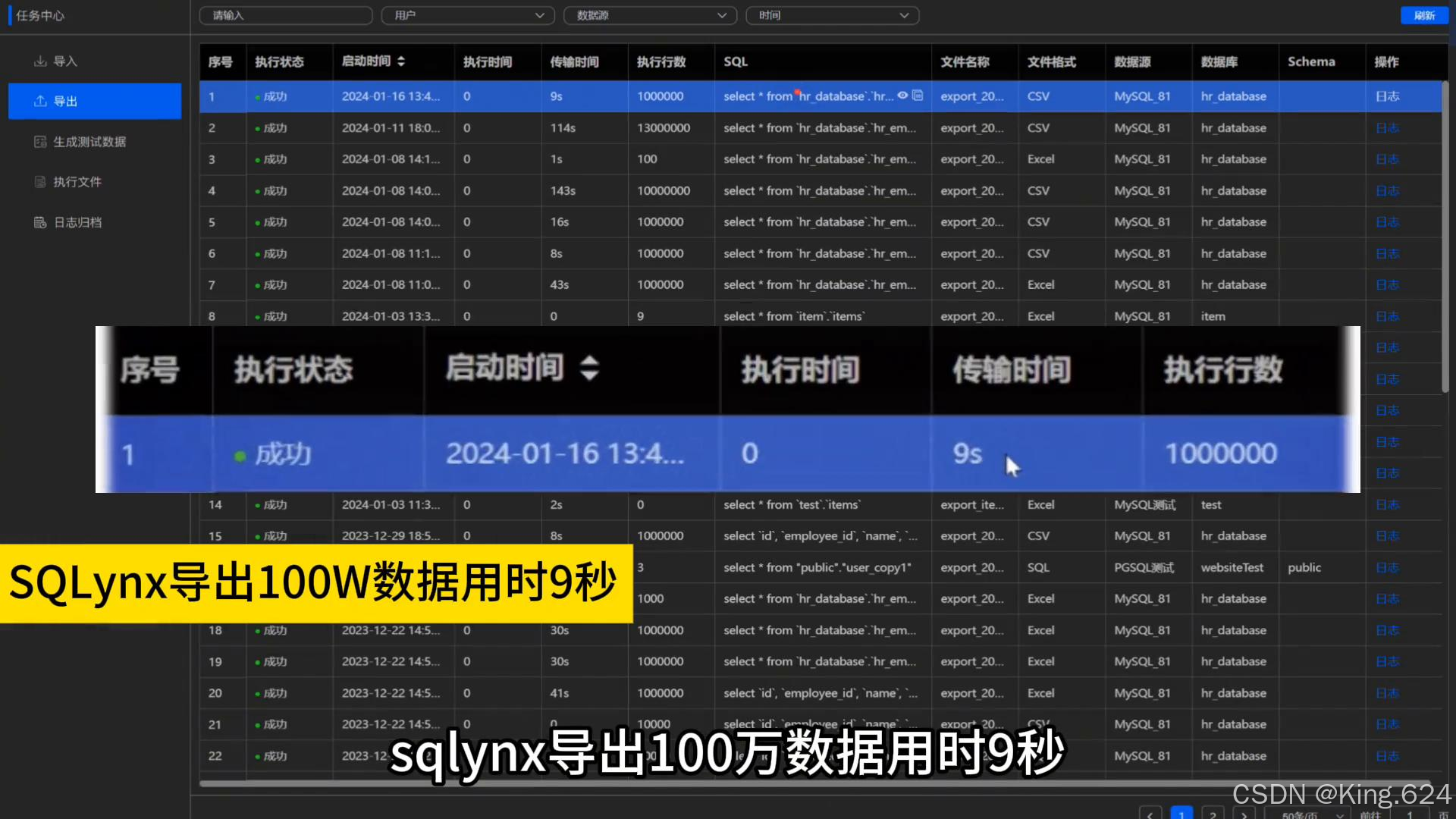下面展示一下sqlynx支持的数据库:除了主流数据库Mysql、PostgreSQL、Oracle、SQLite、MongoDB之外,还支持国产数据库达梦、人大金仓、Oceanbase、openGauss等。首先看一下sqlynx最引以为傲的数据处理能力:navicat导出100万数据用时42秒,SQLynx导出100万数据用时9秒,这仅仅是100万行数据而已。除了这些之外,sqlynx还内置了众
