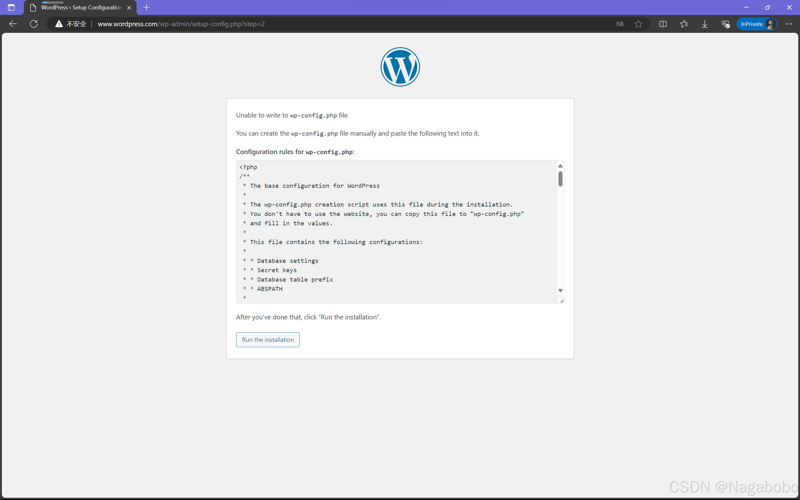 根据要求进行配置,将框内的内容复制到mp-config.php文件中。