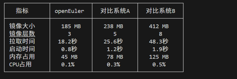 测试数据表明,openEuler容器镜像经过深度优化。185MB的镜像大小比主流发行版减少22%-55%,在大规模容器编排场景下可显著节省存储空间和网络带宽。0.8秒的启动时间为微服务快速扩缩容提供了性能保障。
