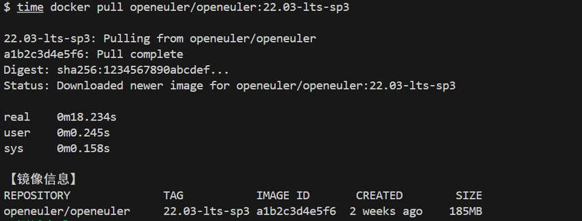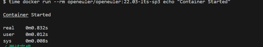 time docker run --rm openeuler/openeuler:22.03-lts-sp3 echo "Container Started"