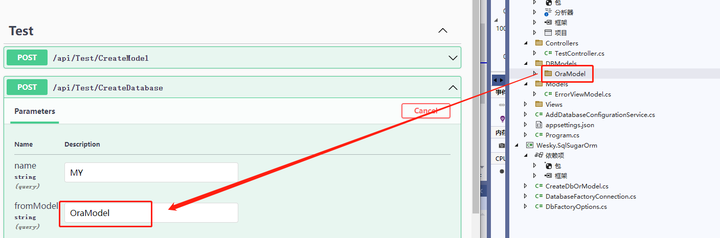 20、新增api接口,用来根据已有实体类,反向生成数据库。包括俩参数,Name对应的是配置文件里面的Name,fromModel对应的是代码文件夹所在的实体类文件夹名称,或者命名空间