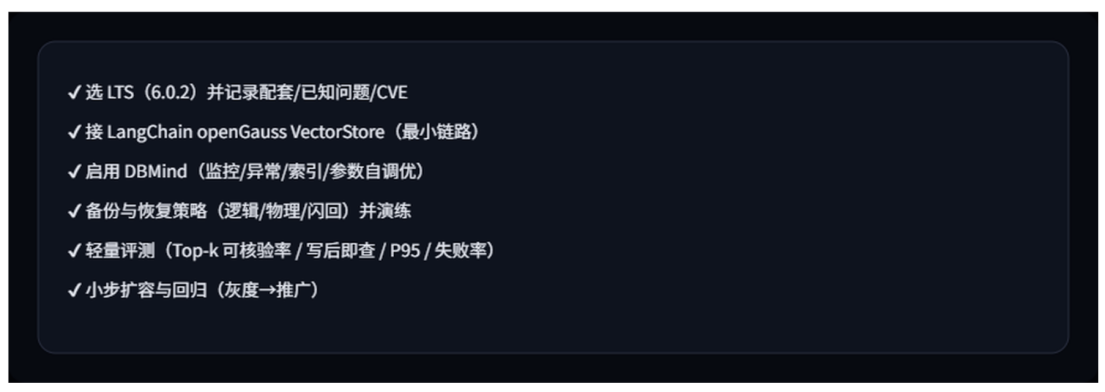 第一步,定版本。 生产上先上 LTS,发行说明、配套说明、已知问题、CVE 链接写进上线单。第二步,接入口。 用 LangChain 的 VectorStore 示例跑通 add_documents / similarity_search,确认写后即查的体验。第三步,开治理。 启用 DBMind,先看监控与异常,再试索引建议和参数自调优,形成建议—验证—回归的小循环。第四步,定兜底。 逻辑备份、物理备份、时点恢复三选二,季度演练一次,截图留档。第五步,做小评测。 两组工况四个指标,写清对比口径,给出结论与边界。第六步,灰度推广。 先上一个业务域,稳定后滚动到邻近域,每次升级前先验证回滚路径。