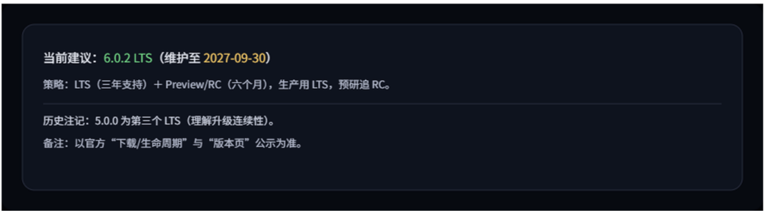 - LTS/Preview 双轨:社区把版本分为 LTS(三年)与 Preview(六个月),RC 的特性会并入对应 LTS。当前 6.0.2 为 LTS,官方页明确维护截止到 2027-09-30,适合作为生产基线