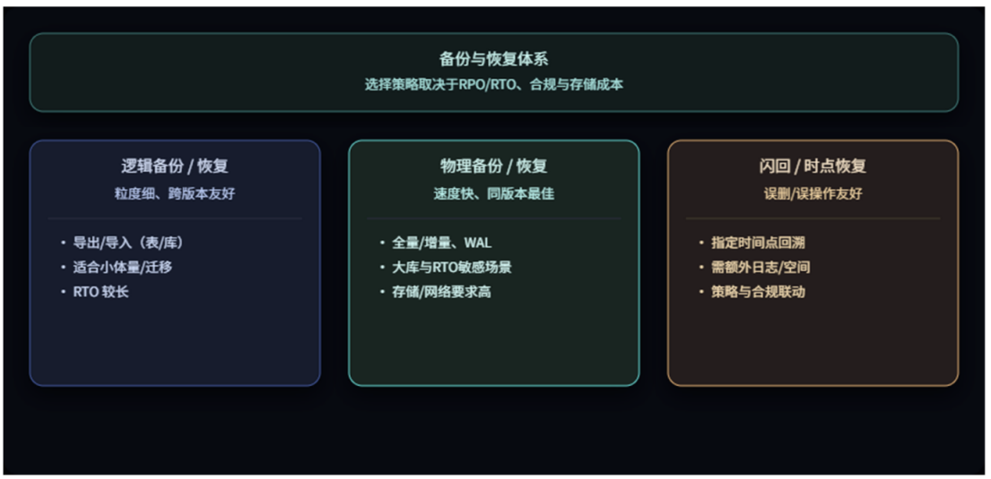 生产环境里更看重的是出事能回,openGauss 把备份恢复做成逻辑、物理、时点(闪回)三条可选路径:小体量或跨版本迁移用逻辑,RTO 敏感场景走物理,全量增量配合