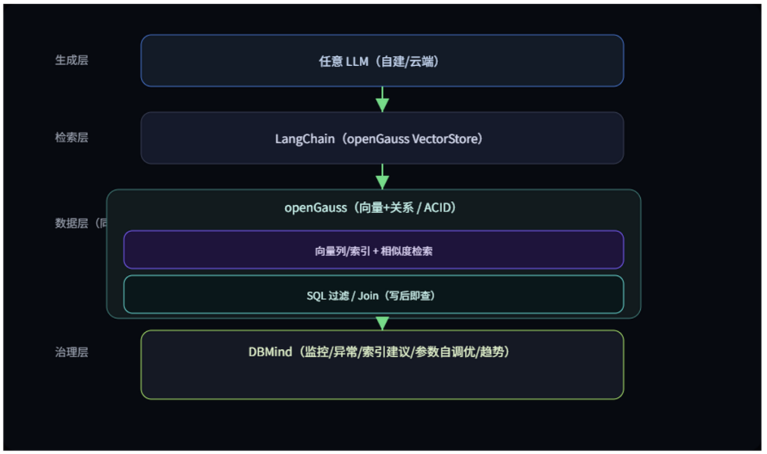 数据层是 openGauss,向量列、向量索引和关系数据在同一事务里协作