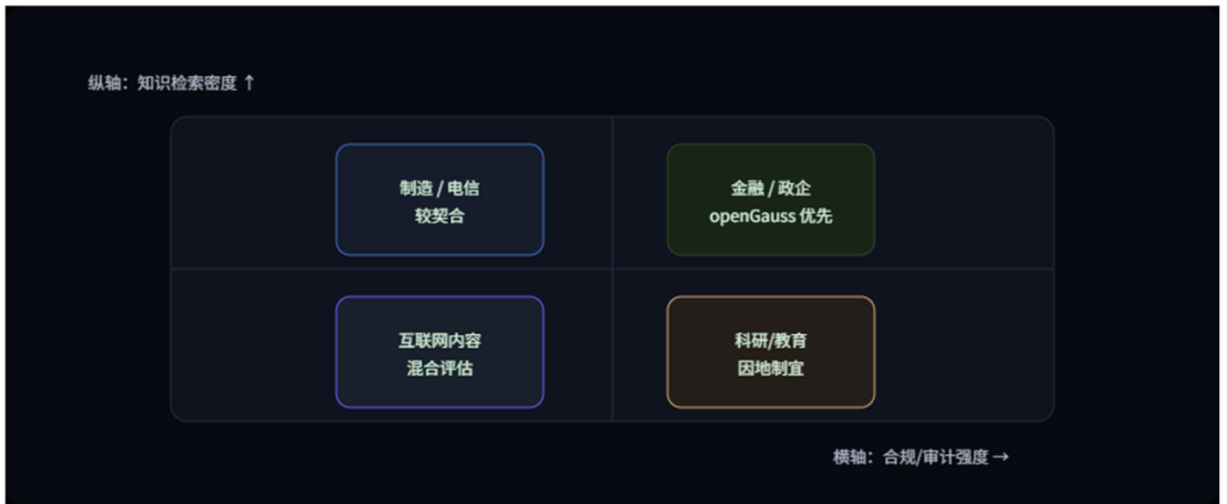 金融、政企、电信、制造这几类,对一致性、合规、审计和可回溯的要求更高,openGauss 的价值会更明显