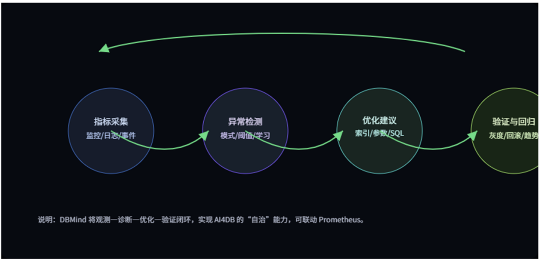 DBMind 的意义,是把观测—诊断—优化—验证做成一个闭环:指标采集和异常检测先把问题框起来,然后给出索引建议和参数自调优,最后用灰度回归验证效果。