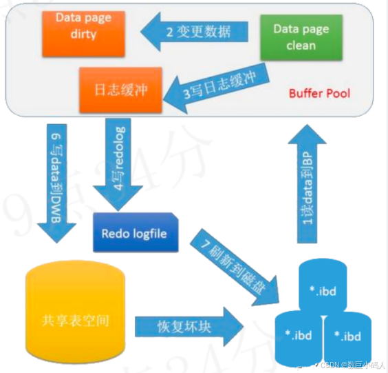 Double write的原理是:将脏页首先写入到double write buffer,再将double write buffer的数据写入各个表空间文件。当发生了极端情况,数据库重启后可以从double write buffer中进行数据恢复。如下图所示。