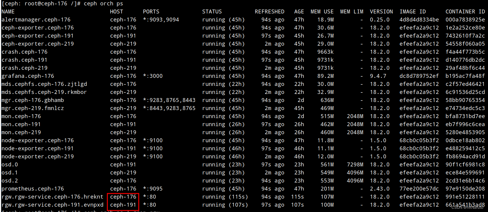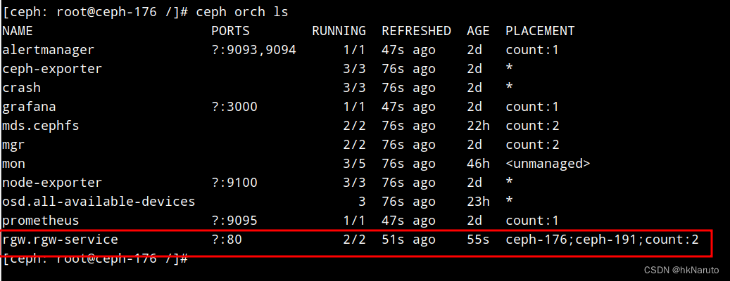[ceph: root@ceph-176 /]# ceph orch apply rgw rgw-service --placement="2 ceph-176 ceph-191"