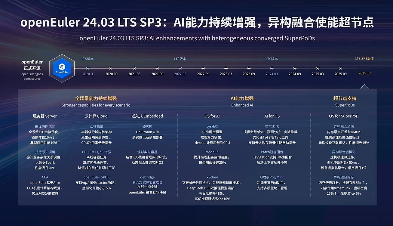 2025年也是计算架构黄金爆发期,“超节点”已经被认为是算力基础设施建设的新常态。以昇腾384超节点为代表的超节点为全球提供了新选择,华为也加大向社区贡献业界领先的AI核心能力,向openEuler社区贡献支持超节点的操作系统插件代码,这就是即将于2025年底上线的全球首个面向超节点的操作系统openEuler 24.03 LTS SP3。openEuler 24.03 LTS SP3不仅开源,还同时支持智算与通算两种计算业务。