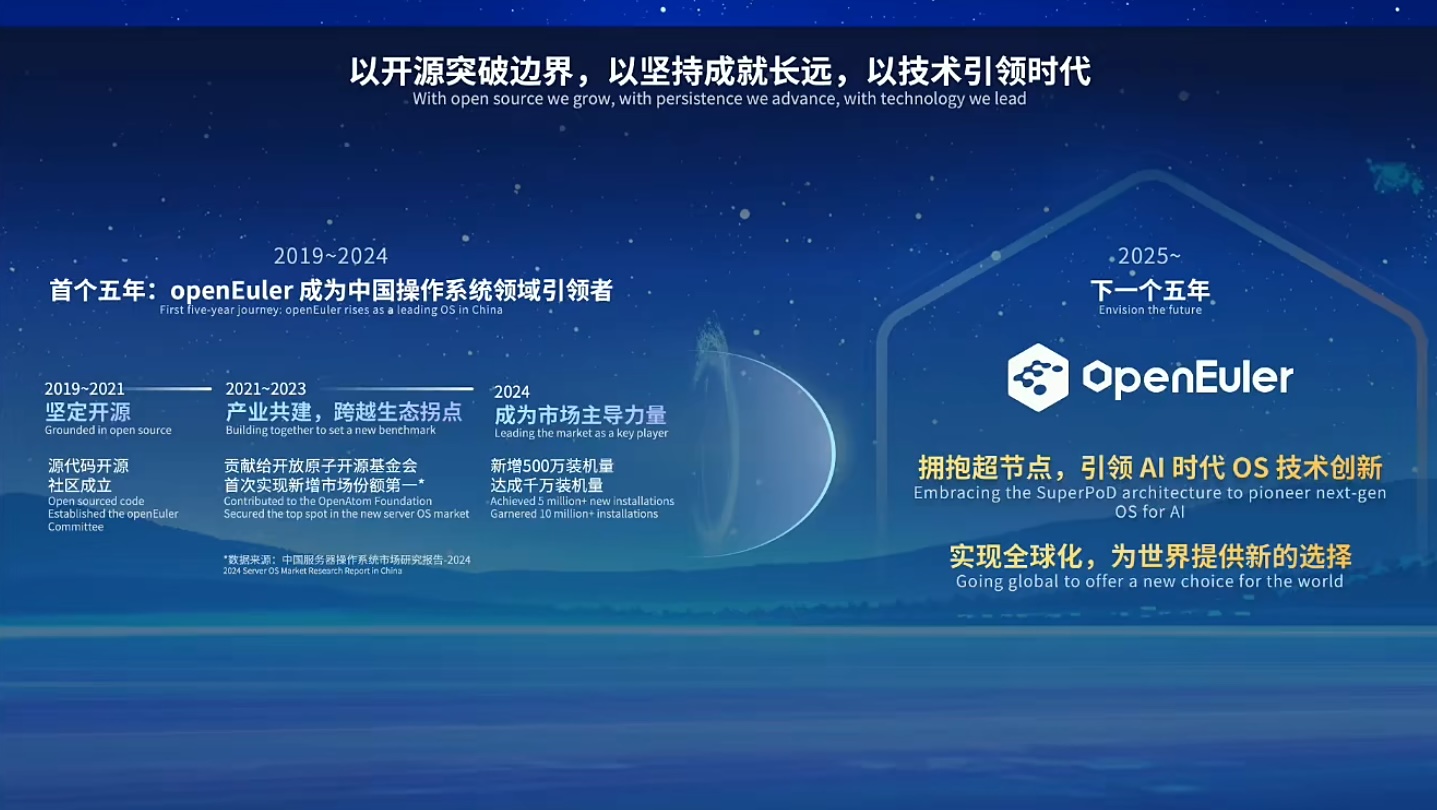 openEuler作为开源社区,天然带有全球化DNA。而在过去的5年间,源自中国的技术在全球化过程,不再只是嵌入到欧美全球化技术体系中,而是需要在欧美全球化技术体系之外,重新建立一个完全源自中国的技术体系,也就是从单点全球化演变成全技术链、生态链、产业链的全球化。openEuler超节点版本不仅提供了新技术路线选择,更要在全球市场通过全技术链、生态链和产业链扎根,将新选择推进到底。