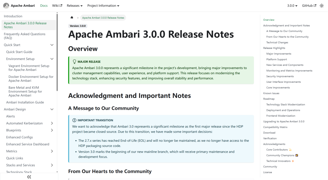 目前,新的 Apache Ambari 3.0 官方网站已经上线,其中包含了 3.0 版本的详细安装教程。由于人力资源有限,网站内容可能存在一些错误或遗漏。