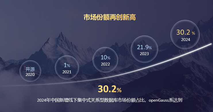 12月27日,openGauss Summit 2024上披露,在2024年线下集中式关系型数据库新增市场份额,openGauss系再创新高,达30.2%;基于openGauss的关系型数据库产品占比达28.5%,超过MySQL和PG,成三个主流开源技术路线之首。