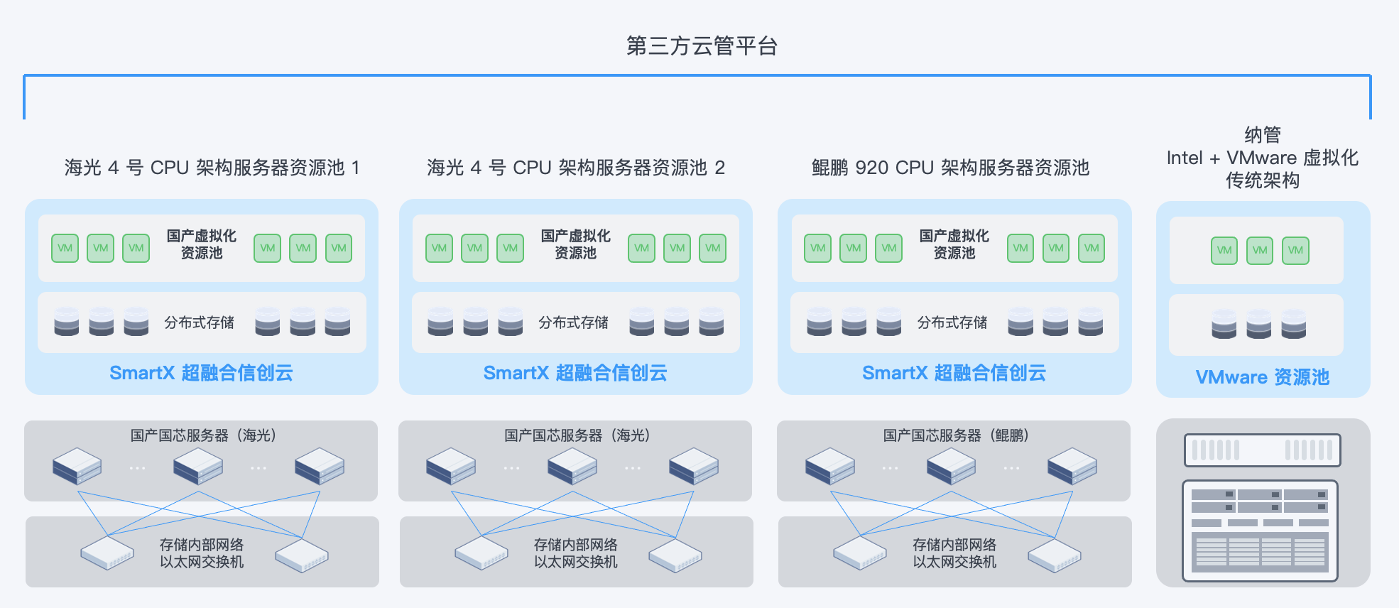 - 一云多芯:分别基于超融合构建两个基于海光 4 号芯片架构的云资源池,和一个基于鲲鹏芯片架构的云资源池,灵活满足多种业务需求。