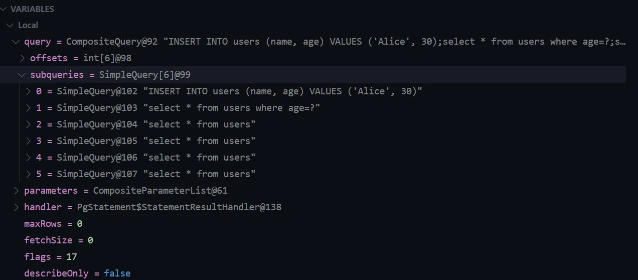 String sql = "INSERT INTO users (name, age) VALUES ('Alice', 30);select * from users where age=?;select * from users;select * from users;select * from users;select * from users;";