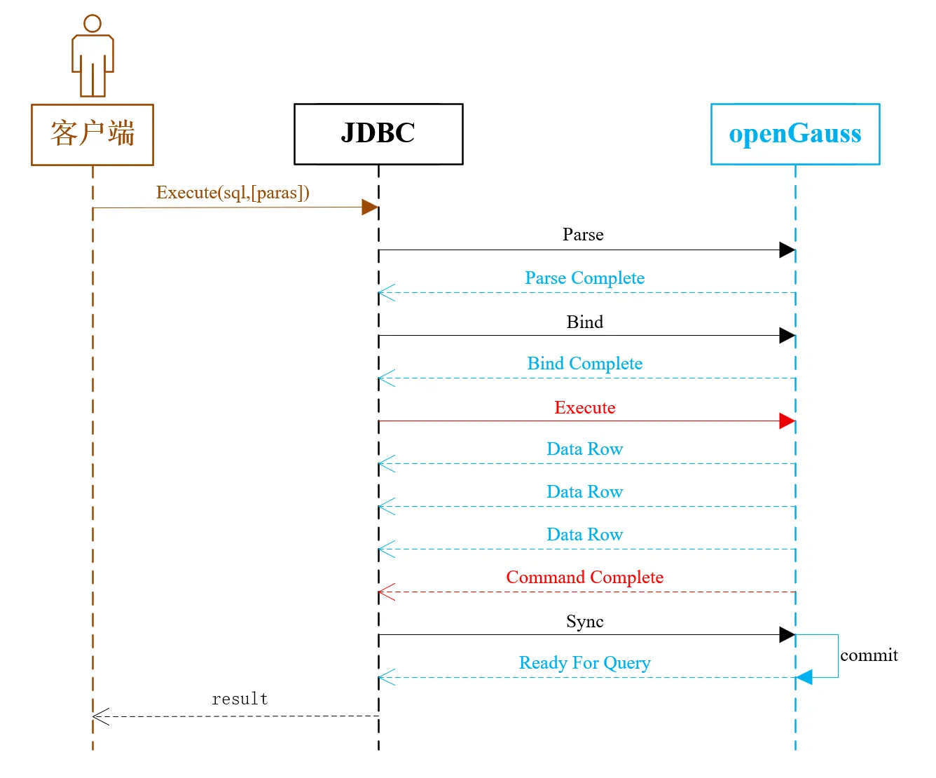 Execute(Portal ID),服务端收到消息后,执行Bind阶段创建的 Portal,执行结果通过DataRow消息返回给客户端,执行完成后发送CommandComplete消息。