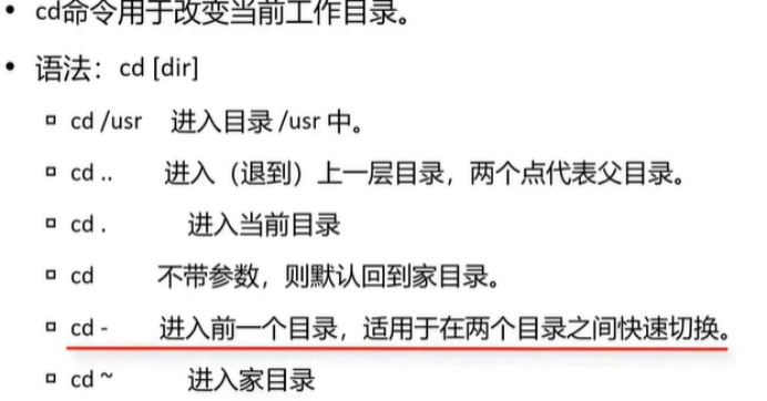 - cd :切换目录, cd /home (进入绝对路径 /home )、 cd …/test (进入上级目录下的 test 文件夹)、 cd ~ (快速回到当前用户主目录)。