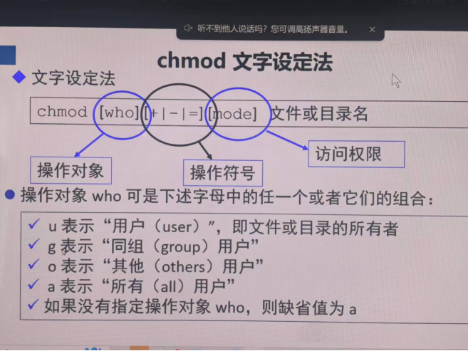 chmod 〔who修改谁的权限〕〔+加一个权限|-减一个权限|=赋值一个权限〕 文件或者目录名