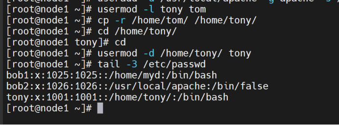 将tom的用户名改为tony 并将其家目录改为/home/tony