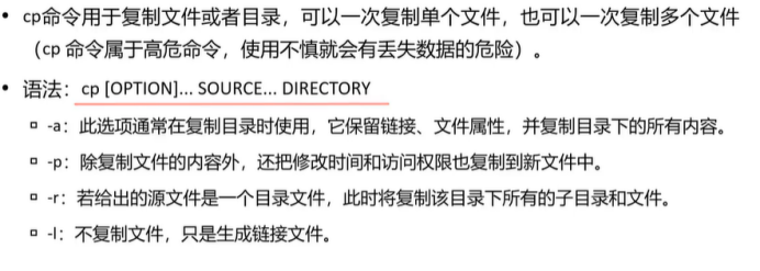 - cp :复制, cp source.txt target.txt (文件复制)、 cp -r source_dir target_dir (目录复制)、 cp -p file1 file2 (复制时保留文件原权限/修改时间)。