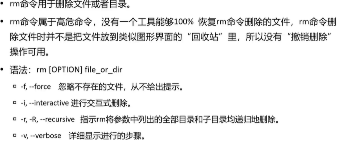 - rm :删除, rm file.txt (删文件)、 rm -r old_dir (删目录及所有子内容)、 rm -rf * (强制删除当前目录所有文件,慎用)。