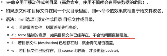 - mv :移动/重命名, mv old.txt new.txt (重命名文件)、 mv file.txt ./docs/ (将文件移到当前目录的 docs 文件夹)。