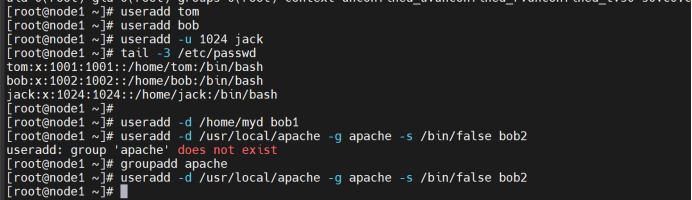 以root用户登录,创建用户tom、bob、Jack,并指定jack的uid为1024