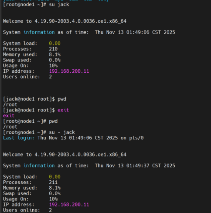 Su - jack 切换并加载目标用户(jack)的完整环境(包括家目录、配置) 切换后进入/home/jack目录