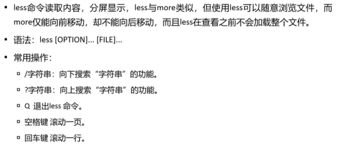 - more / less :查看大文件(分页), more long.log (按空格键翻页, q 退出)、 less long.log (支持上下键滚动, /关键词 搜索内容)。