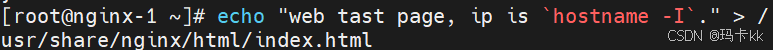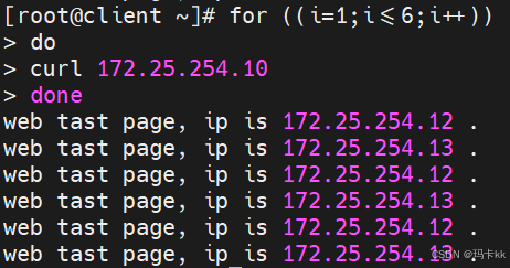 在server1和server2主机的/usr/share/nginx/html/index.html中写入web tast page, ip is `hostname -I`。从客户端上使用curl访问VIP