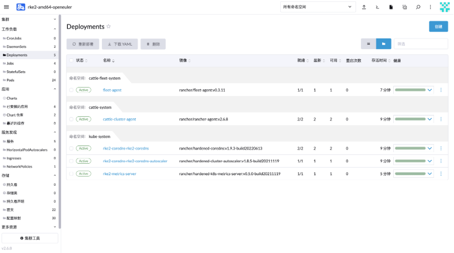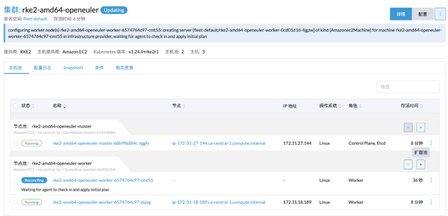 使用 Node Drvier 方式最具特色的能力,就是可以快速进行集群扩容。因为 Rancher 连接了 EC2 API,并且会根据集群配置状态自动将部署任务下发给新的 openEuler 节点。