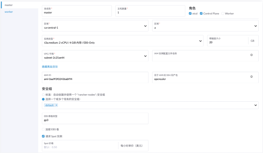 创建 RKE2 集群时,选择 EC2 Node Driver,配置 RKE2 节点模板,以及集群的基础参数配置。在 AWS 上,选择先前构建的 AMI,并使用 openEuler 作为 SSH User,同时选择 Spot 竞价实例,对于普通的测试环境可以极大程度减少费用。