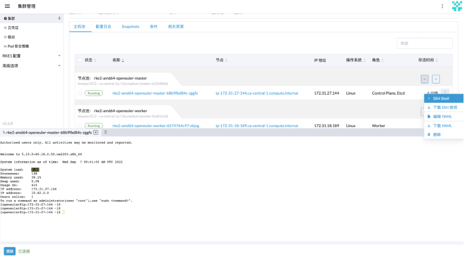 通过 UI 以 SSH 灵活访问 RKE2 节点,这些节点使用 openEuler Linux。这取决于我们先前配置 openEuler AMI 以及其 SSH User。