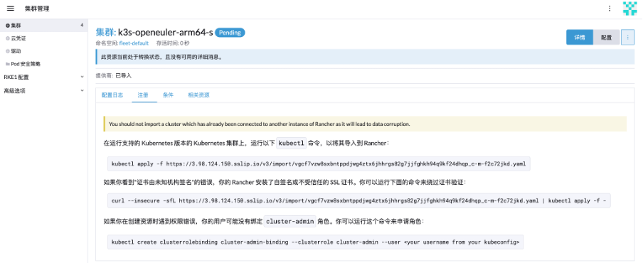 另一个 K3s ARM64 集群的创建和导入也十分简单,无需特别的参数处理。一旦 K3s ARM64 和 Rancher Server 都准备妥当之后,使用 Generic Import 导入即可。实际,我们可以看到这样的效果:
