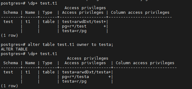 这里我们注意到,表修改属主前后,表的访问权限的被赋权者/赋权者会被自动调整,被赋权者/赋权者如果是之前的属主会改为当前的属主