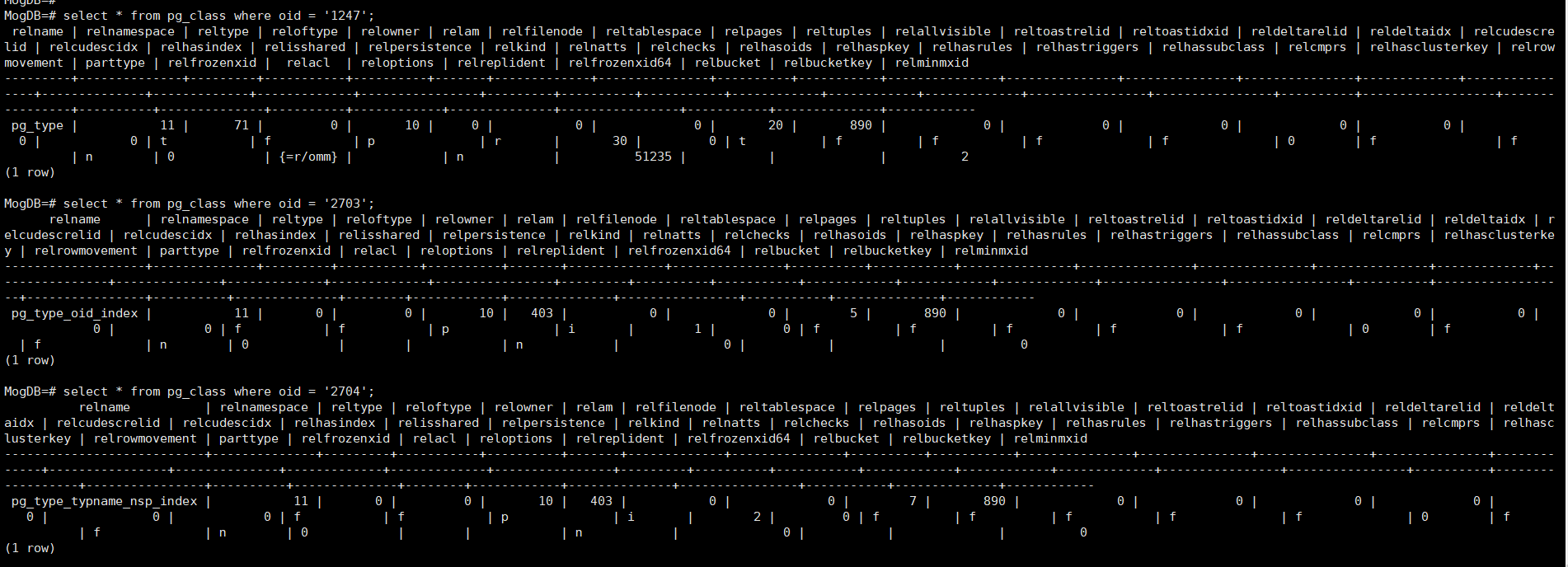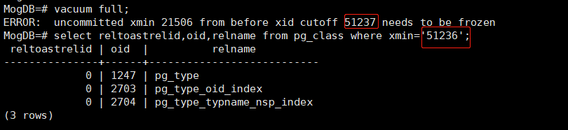 通过返回结果猜测数据库在已经不允许执行事务的情况下被回滚的, 所以显示为uncommitted xid。 根据 vacuum full 提示,它跳过了 pg_type 表,并且建议我们用maintenance 模式去 vavuum full 处理它。 此外我们根据提示的 xmin 可以找到对应的是 pg_type 以及两个索引。