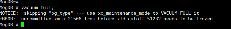 报错为ERROR: uncommitted xmin 21506 from before xid cutoff 51237 needs to be frozen