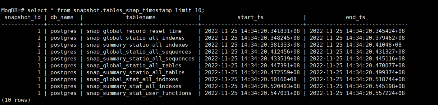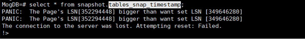 但是比较好的一点是,MogDB/openGauss 的 maintenance 模式不需要 PostgreSQL 那样需要停掉 PostgreSQL 数据库再去使用。在测试 openGauss/MogDB 的时候,发现主库查询 snapshot.tables_snap_timestamp 这个表的时候,一 select *,数据库就宕机,而备库是正常的。在分析的时候,因为是测试环境使用了 vacu