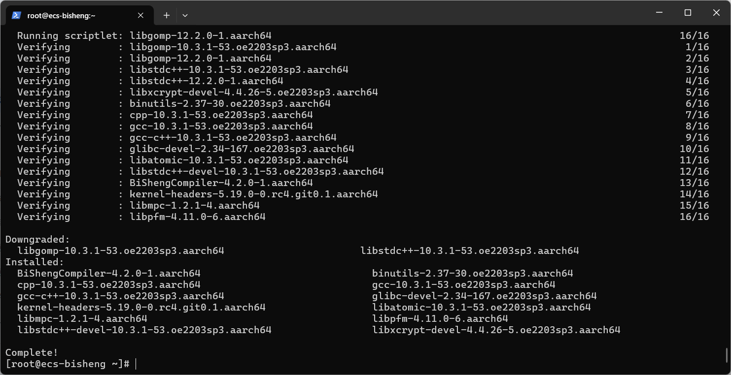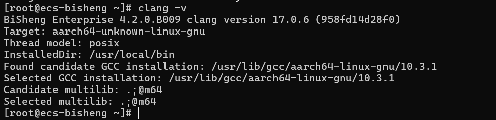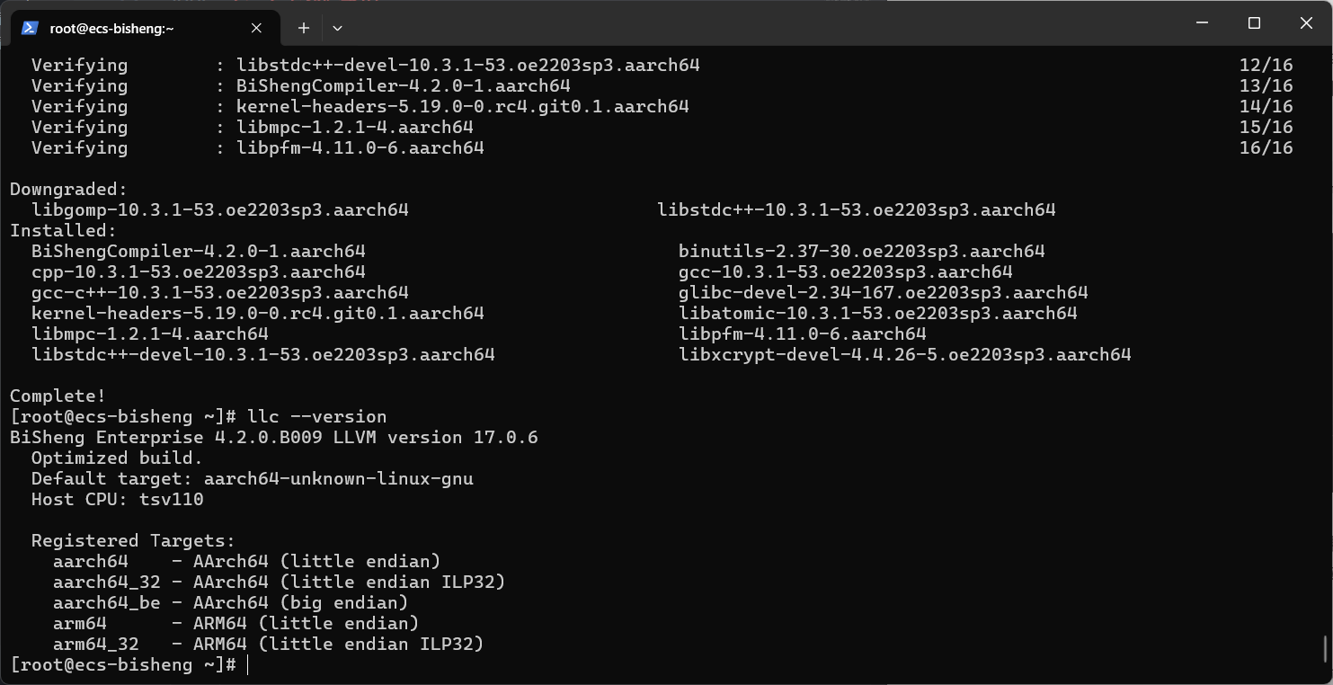 验证安装是否成功:安装完毕后执行如下命令验证毕昇编译器版本: