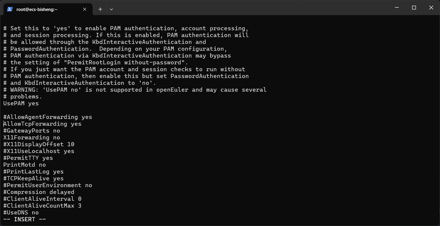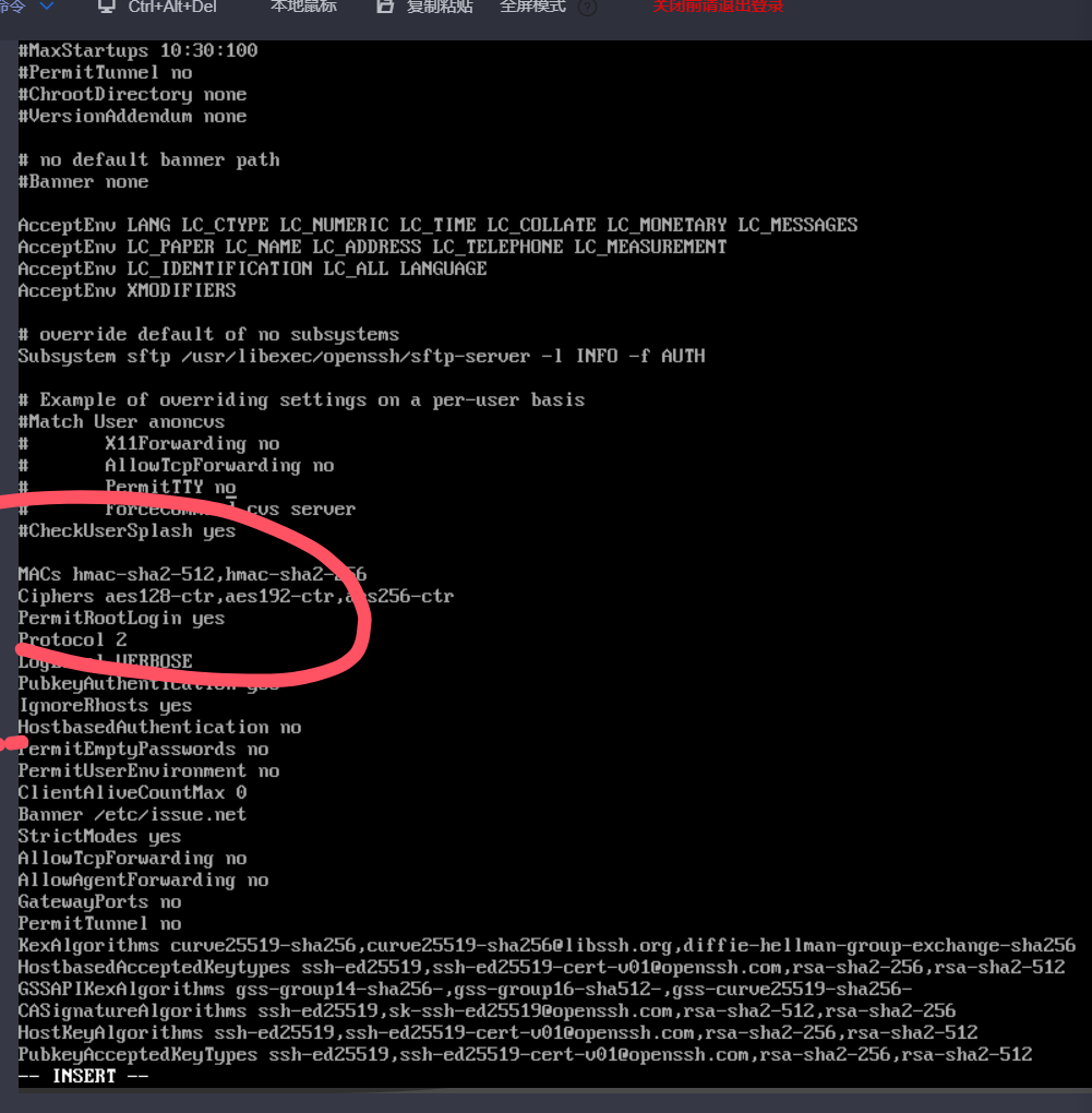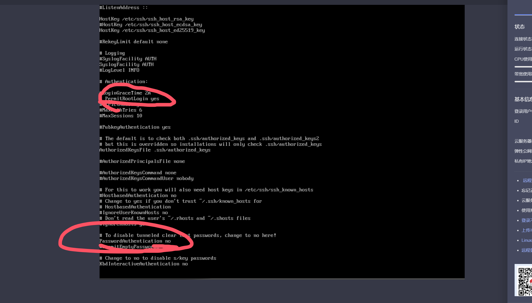 i进入编辑模式,找到PasswordAuthentication no,修改为yes,同时PermitRootLogin也修改为yes,注意这里一共修改三个位置。不过这是我之前的截图,如果你只找到两个也是正常的,可能是因为配置安全组的时候没有配置2端口。反正只要port22对应的配置修改了就可以。 - 修改完之后按esc退出编辑模式,输入