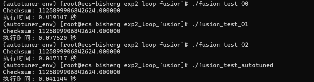 (autotuner_env) [root@ecs-bisheng exp2_loop_fusion]# ./fusion_test_O0 Checksum: 1125899906842624.000000 执行时间: 0.419147 秒 (autotuner_env) [root@ecs-bisheng exp2_loop_fusion]# ./fusion_test_O1 Checksum: 1125899906842624.000000 执行时间: 0.077520 秒 (autotuner_env) [root@ecs-bisheng exp2_loop_fusion]# ./fusion_test_O2 Checksum: 1125899906842624.000000 执行时间: 0.047117 秒 (autotuner_env) [root@ecs-bisheng exp2_loop_fusion]# ./fusion_test_autotuned Checksum: 1125899906842624.000000 执行时间: 0.041144 秒
